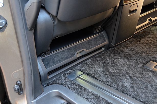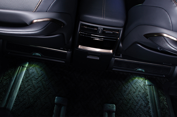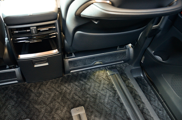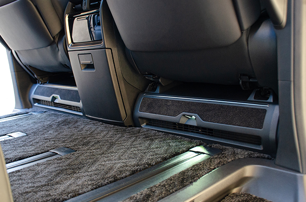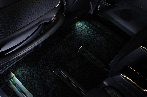 こちらの商品は "フットランプ イルミネーション" 付きのフットレストとなります。純正では、引き出し付きのトレーが付いたフロントシート アンダーカバーですが、樹脂製でチープなデザインをしています。それに比べ、この商品はメッキモール付きのフットレストにする事で高級感あふれる物とし、フロントと連動したフットランプが、夜の室内空間もより一層高めることが出来ます。さらに、フットレスト部分もカーペット生地となっていますので、より上質な空間へと演出します。