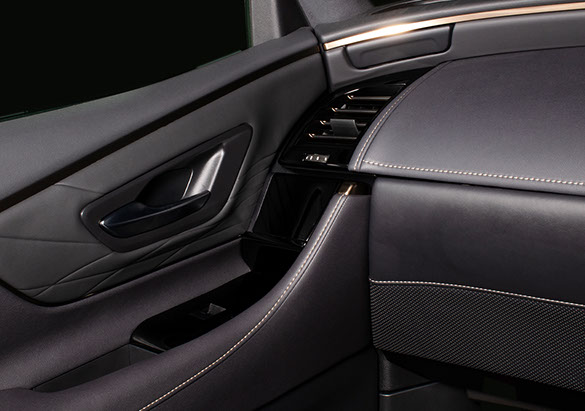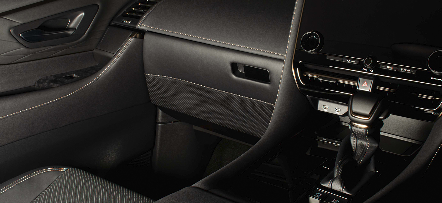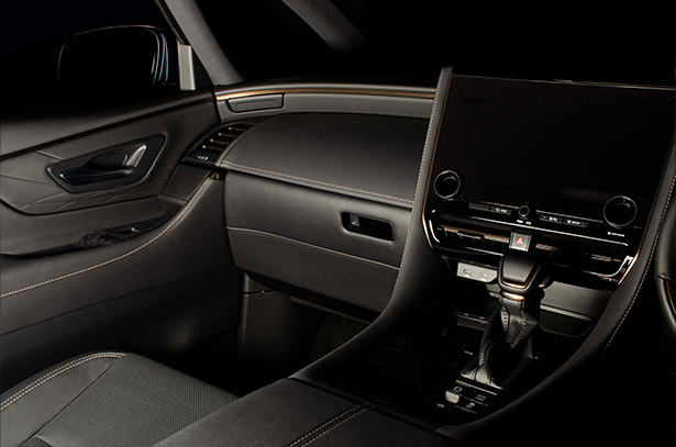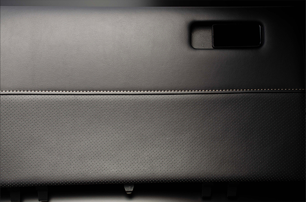 純正グローブボックスの加工品です。製品下部には純正シートと同じ様なスポーティなパンチング素材をあしらい、製品上部にはレザーを貼り込んでいます。また、その境には純正近似色のステッチをあしらいました。その仕上がりは上質で高級感のあるインテリアを実現します。