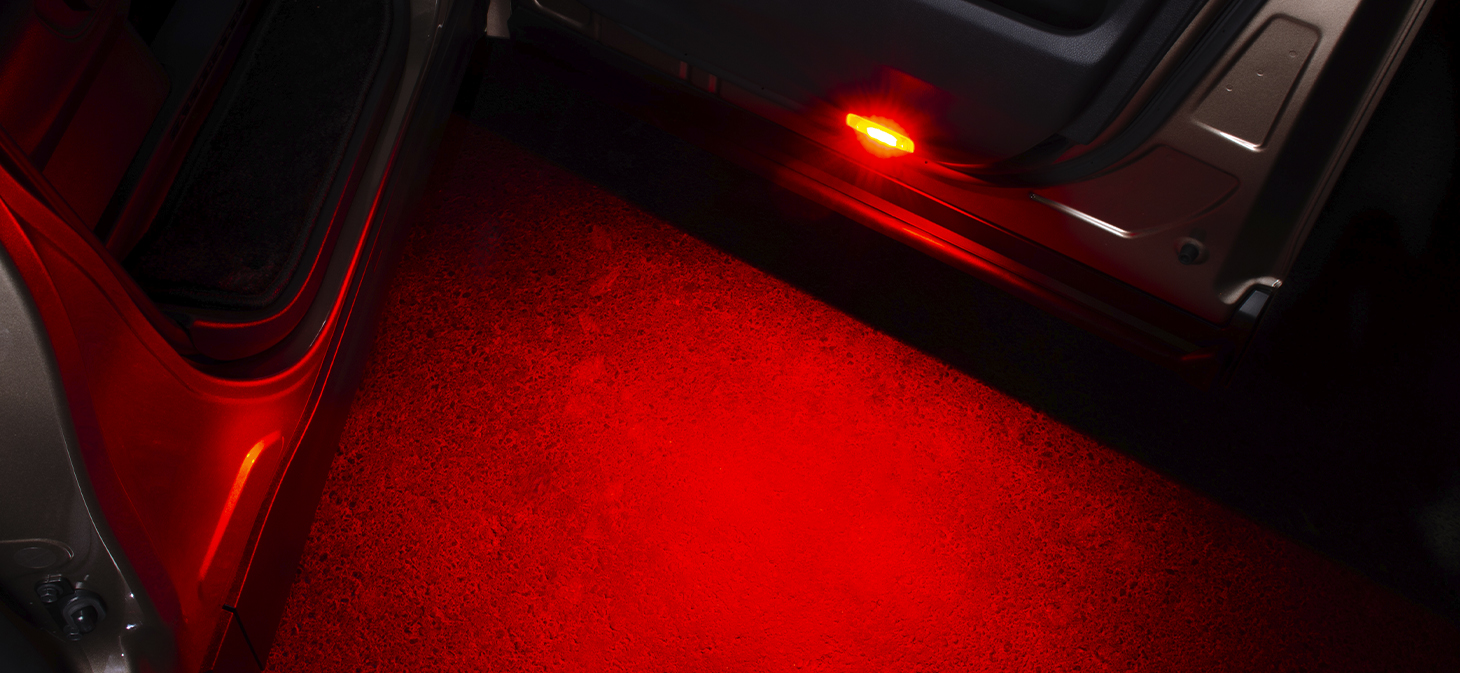 北米仕様な雰囲気を愉しめる事で人気の赤い照明を放つカーテシランプのユニットを、まるでハイマウントストップランプかの如く強烈な照射光でファッション性を組み入れた遊びココロのカーテシランプがお愉しみ頂けます。消灯時のレンズも赤色とするため、レッドレンズを専用で用意。そこに内蔵する6ヶ所点灯のLED基盤は、よもやカーテシランプとしては必要以上の明るさを放ち鮮明に照らし上げる光量をお届け致します。