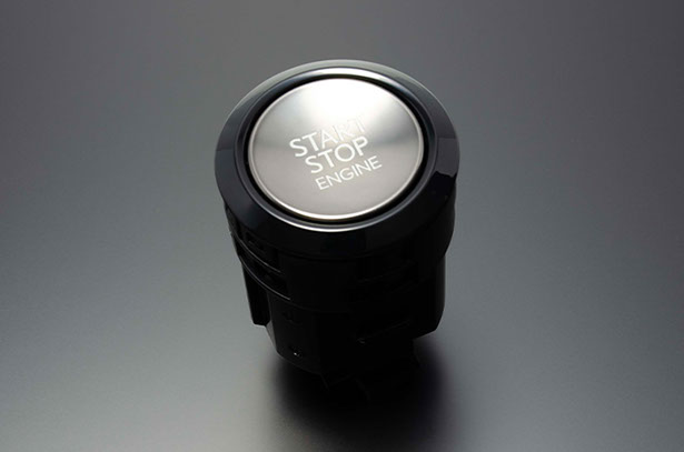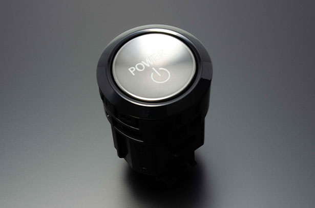 LEXUS 意匠のHYBRID 用スタートボタンです。トヨタとは異なった光輝シルバーのボタンは逆アールのかかったデザインで、触り心地も流石レクサスといった感触です。外周のリングもトヨタとは異なり、丸みを帯びたスムーズなイメージとなります。ハイブリッド意匠ですが、ガソリン車にも使用出来ます。
