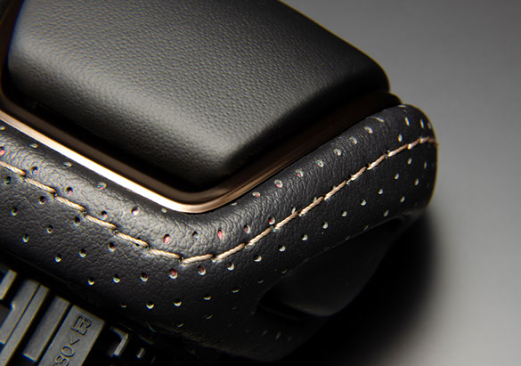 純正シフトノブの加工品です。シフトノブサイド部には純正シートと同じ様なスポーティなパンチング素材をあしらい、製品上部にはレザーを貼り込んでいます。また、その境には純正近似色のステッチをあしらいました。その仕上がりは上質で高級感のあるインテリアを実現します。