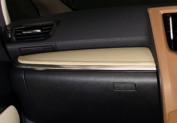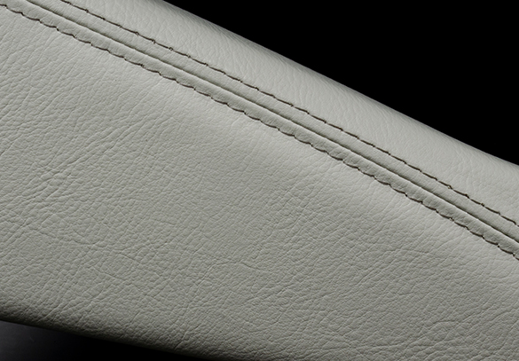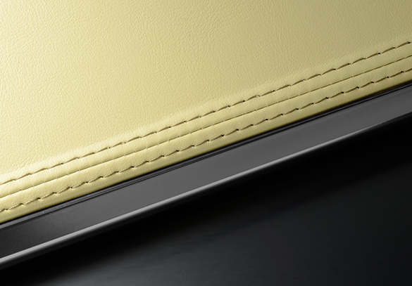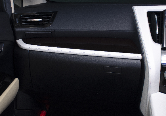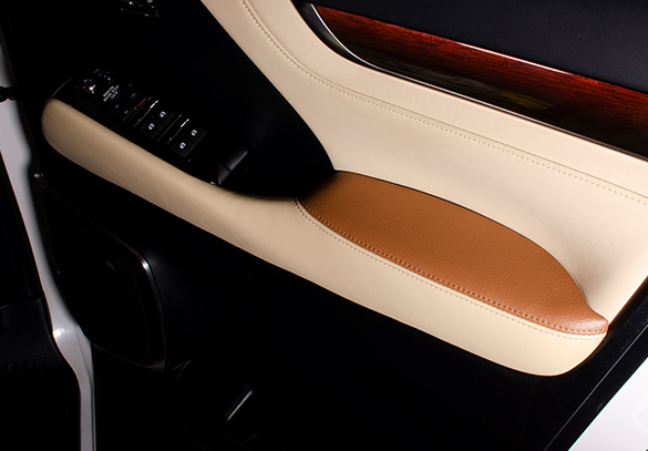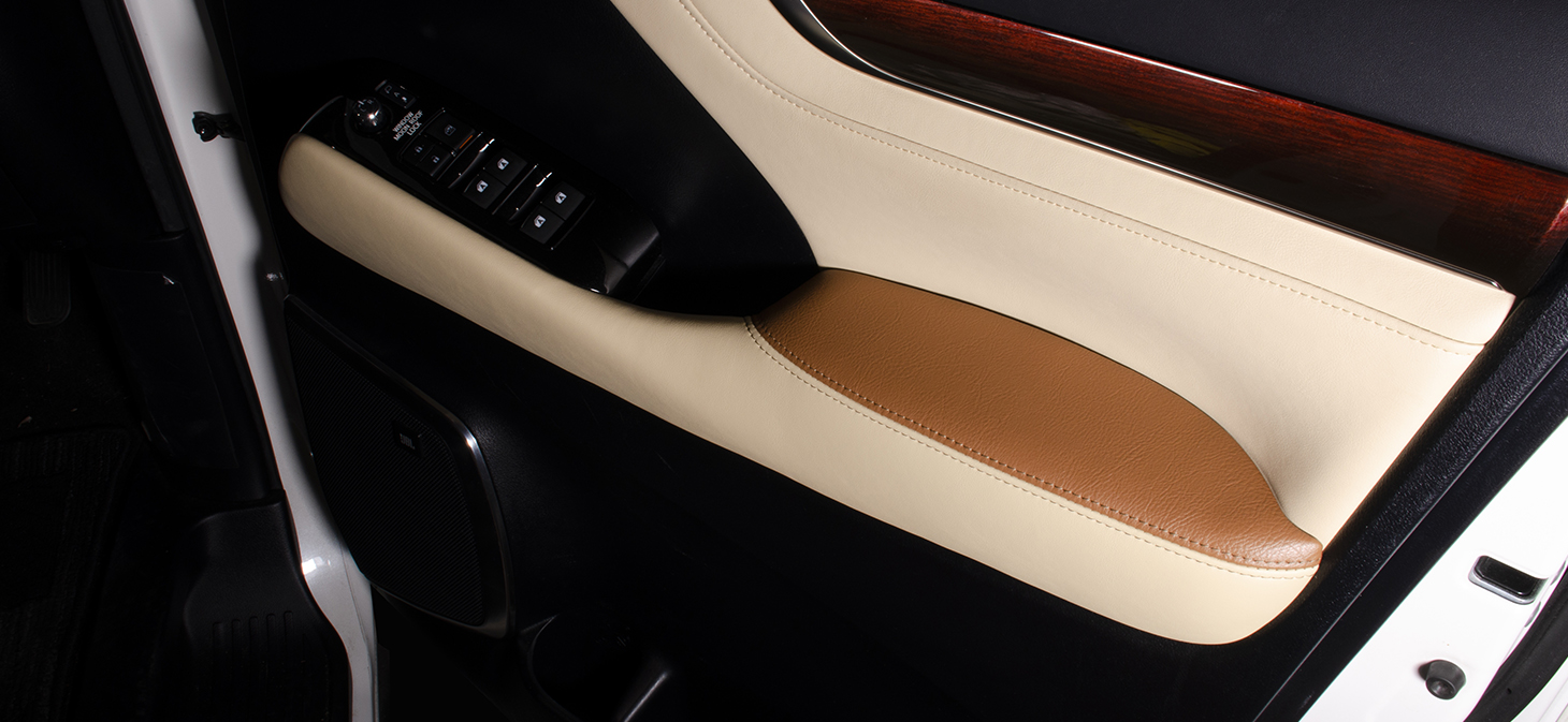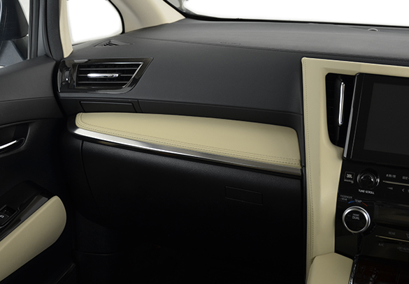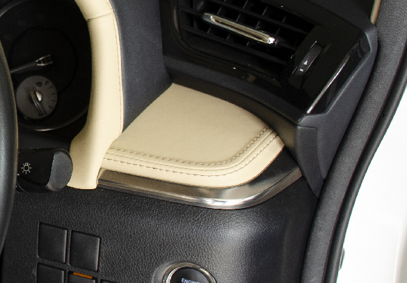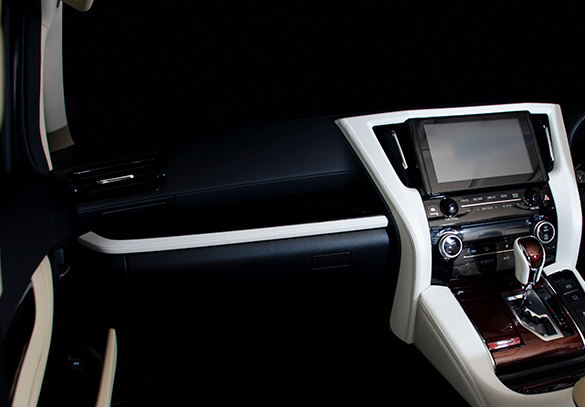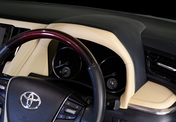 助手席側パネルガーニッシュの天面部分にPVCレザーを貼込み、さらにダブルステッチを施した商品です。純正オーナメントはあえて消し、内装色への統一を計った製品です。