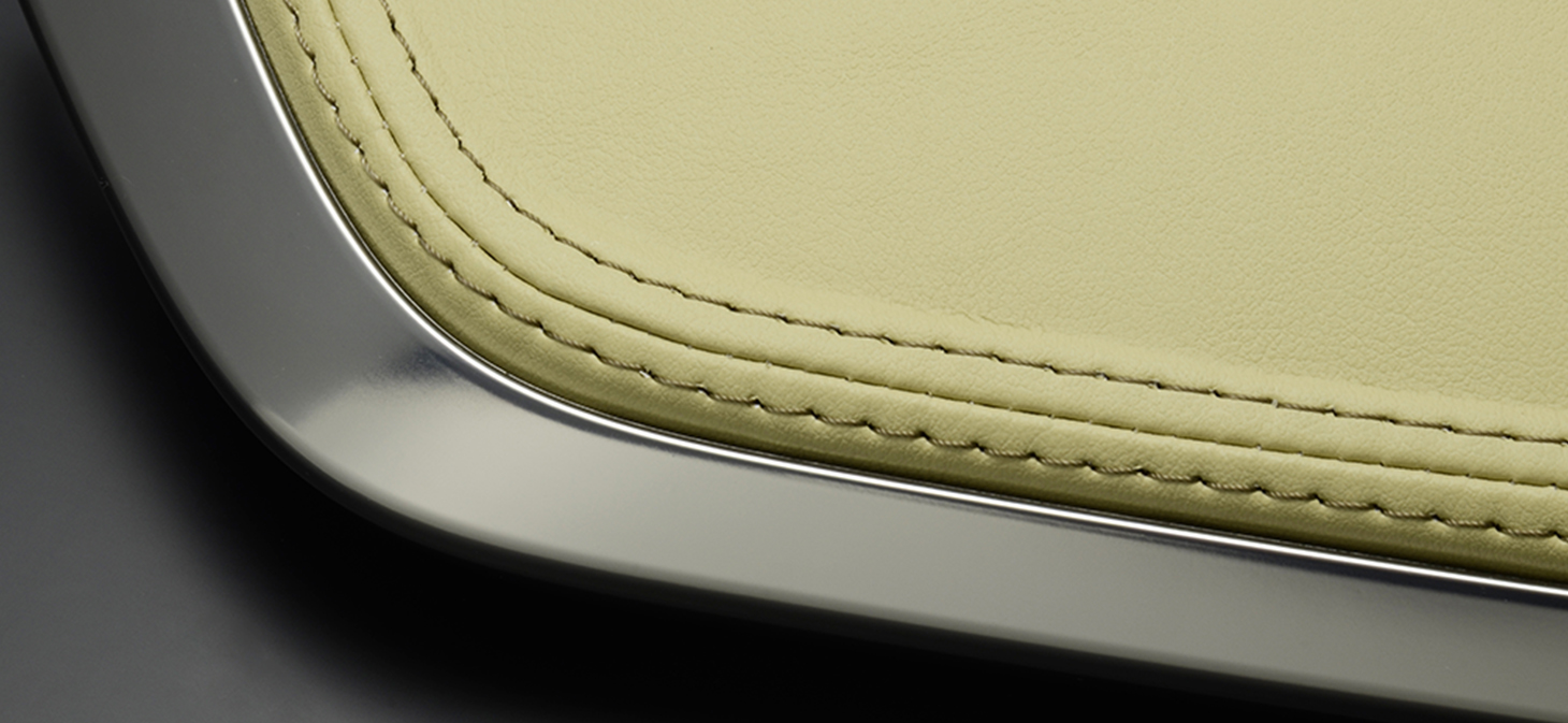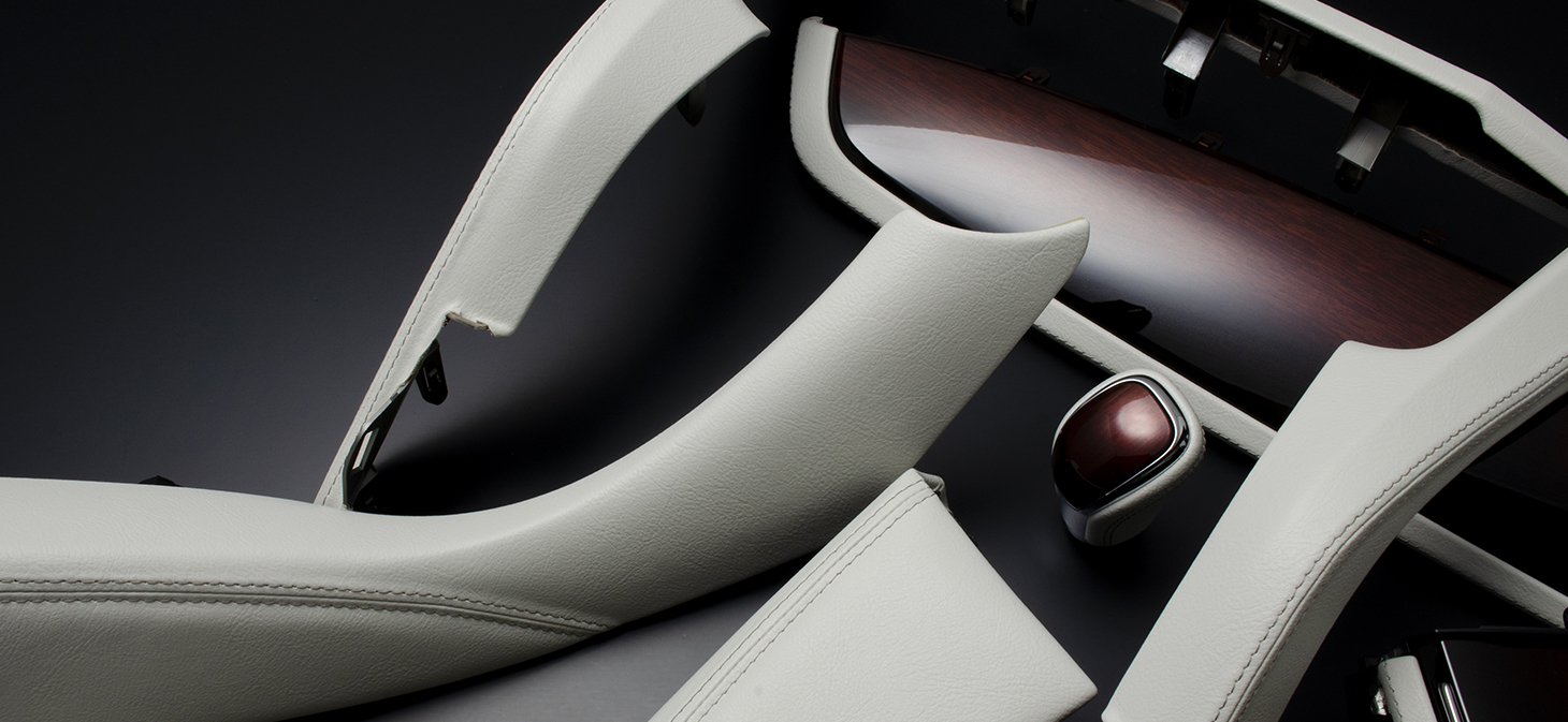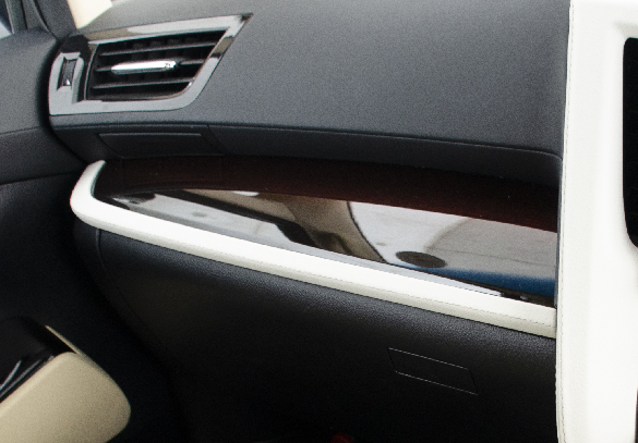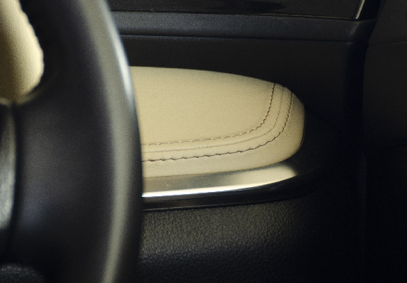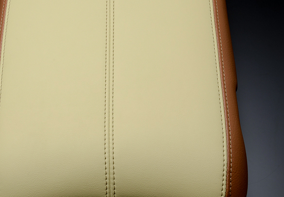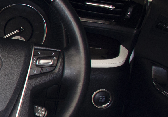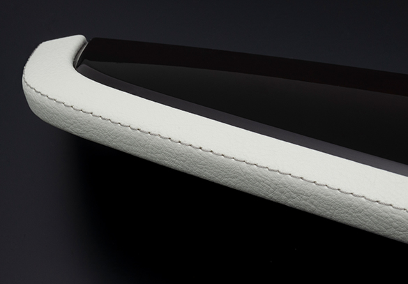 助手席側パネルガーニッシュの天面部分にPVCレザーを貼込み、さらにダブルステッチを施した商品です。純正オーナメントはあえて消し、内装色への統一を計った製品です。