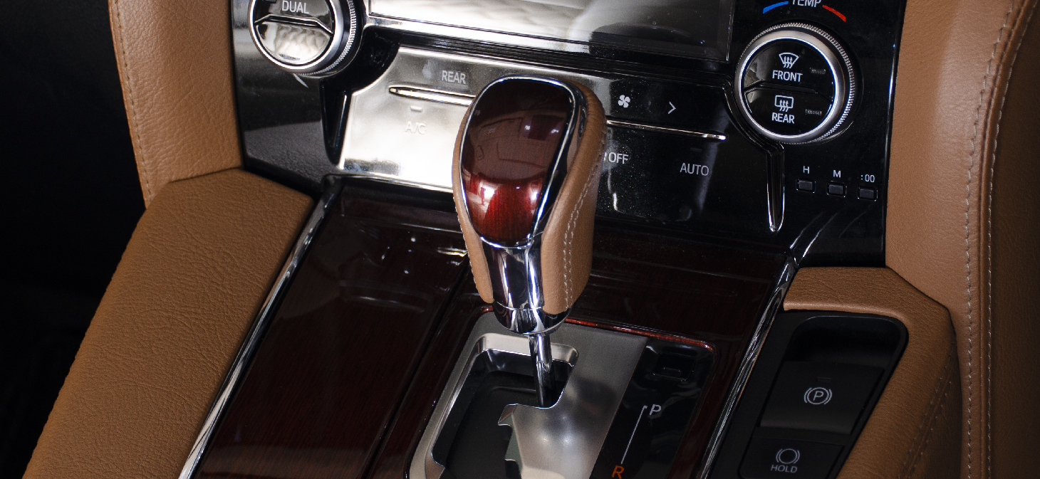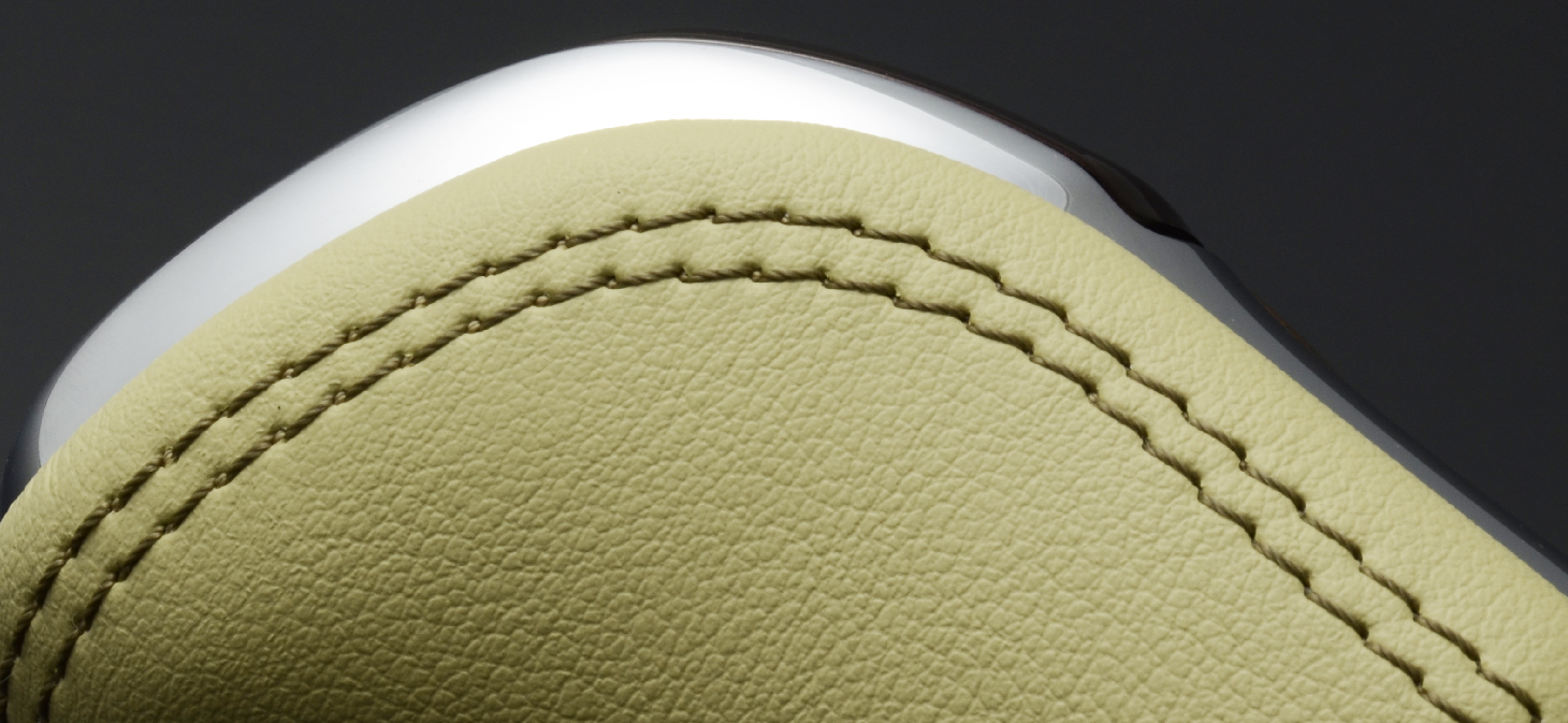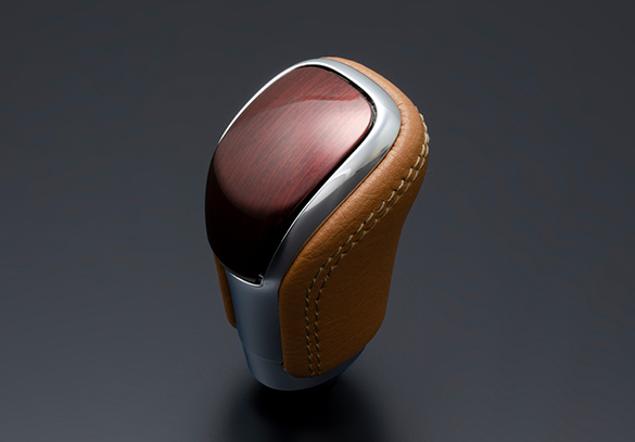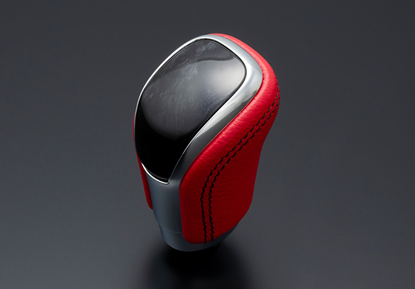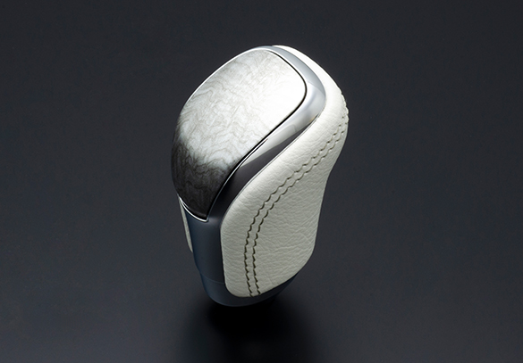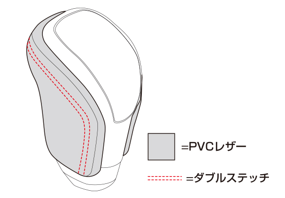 純正シフトノブに合皮レザーを貼り込み、サイド部分から後ろに回り込むようにダブルステッチを施しております。純正部品はゴム素材をレザーのように見せている だけですが、実際に貼りこまれたPVCレザーの見た目と感触は純正とは全く異なった