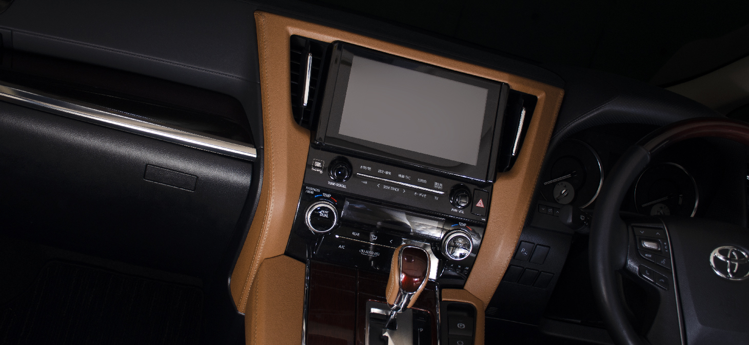 純正ナビパネルに合皮レザーを巻き込み、純正仕上げのようにサイド部分にはダブルステッチを施しております。このパーツの構成は大きく、ここを変えるだけで室内全体のイメージが変わると言っても過言ではありません。